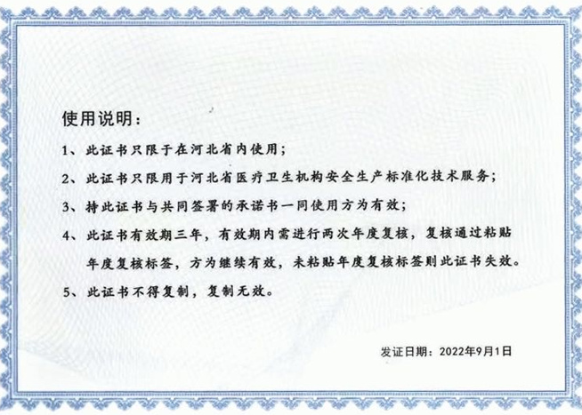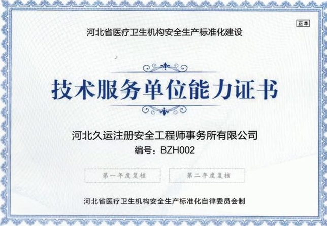 河北久运注册安全工程师事务所是河北省医疗卫生机构安全生产标准化自律委员会发起单位,是自律常委会常委。具有河北省医疗卫生机构安全生产标准化自律委员会颁发的技术服务单位能力证书(编号:BZH002),是共同签署承诺书的技术服务单位。